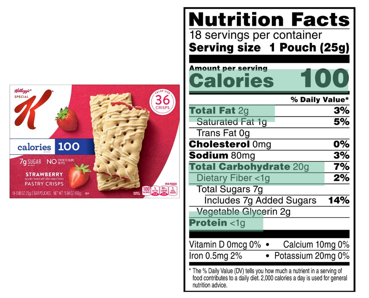 Here’s another example below of 100-calorie Special K bars. Each bar contains the quintessential 100 calories from mostly starch. There is only 2 g of fat per bar, not even 1 g of protein, and no fibre.
