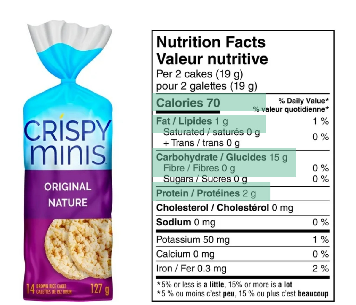 Look at the example below of rice cakes. Each rice cake contains 35 calories, which may be appealing to someone who is looking for a low-calorie food item. But they’re also low nutrient - under a gram of fat per cake, 7 g of carbs, no fibre, and only 1 g of protein. This is unlikely to be a satiating option, and isn’t doing much to help you meet your daily nutrient needs.