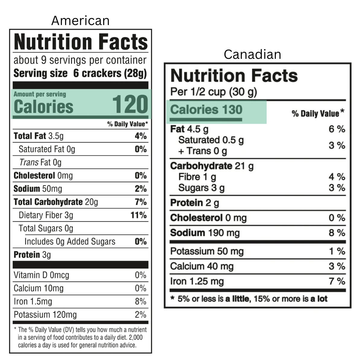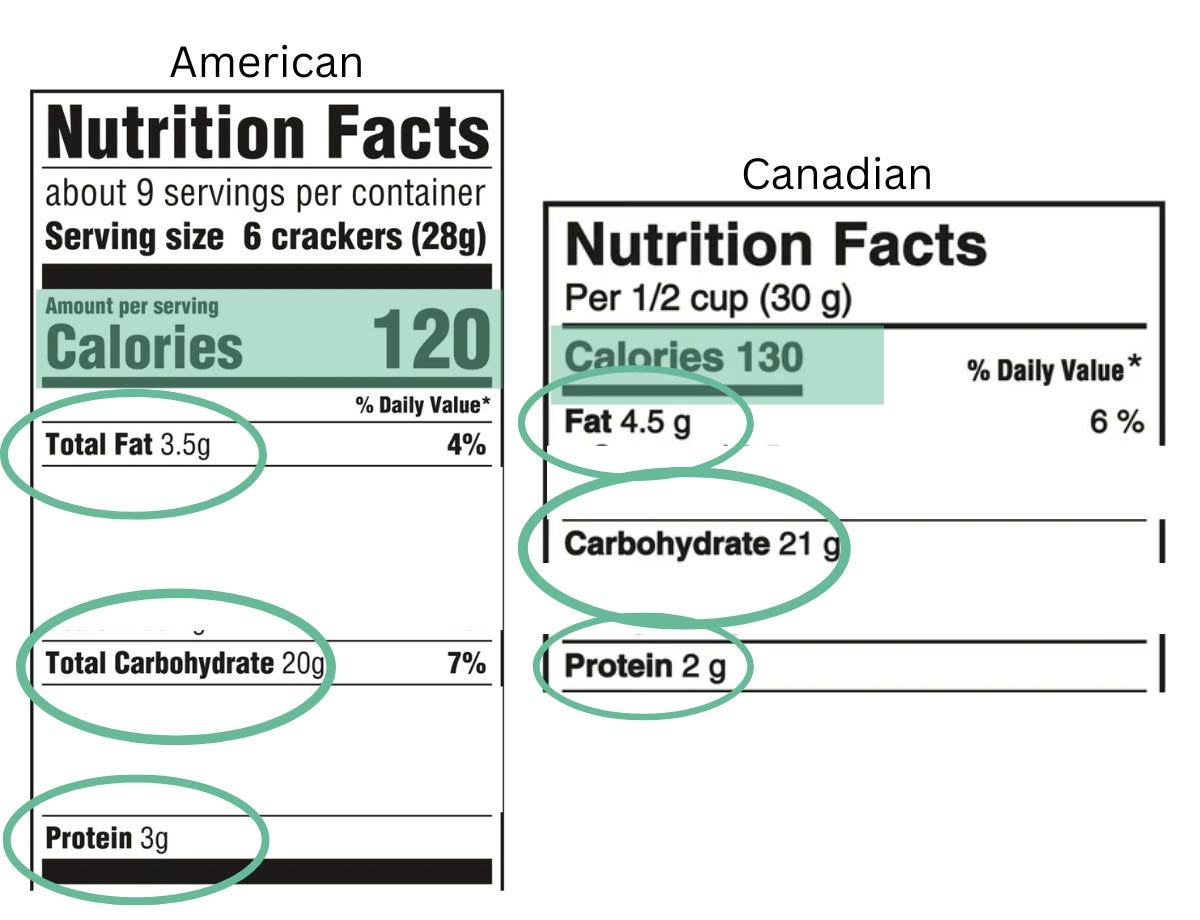 The Nutrition Facts tables below highlight these three nutrients. In the American version, the 120 calories in the crackers are from 3.5 g of fat, 20 g of carbohydrates, and 3 g of protein. In the Canadian label, the 130 calories are from 4.5 g of fat, 21 g of carbs, and 2 g of protein.