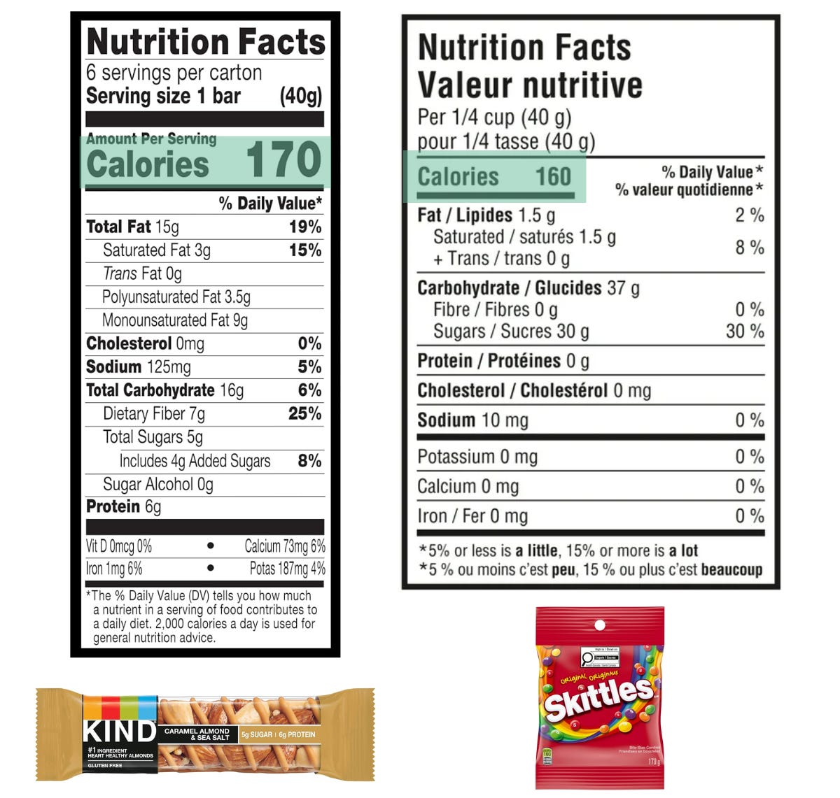 The KIND bar on the left has 170 calories from a mix of nutrients - 15 g of fat, 16 g of carbohydrates (including 7 g of fibre), and 6 g of protein. The candy, on the other hand, has 160 calories almost entirely from sugar. While the calorie counts are similar, the way these foods affect your body is very different.