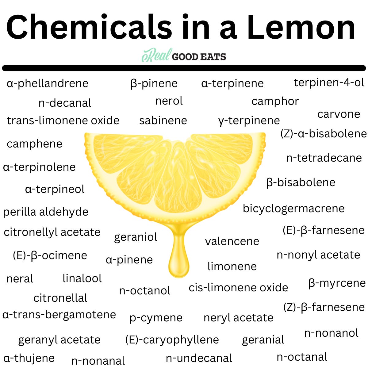 Another reason is that flavour profiles are complex. For example, a lemon has more than 30 components that make up the aroma we recognize as lemon (α-terpinene, α-pinene, limonene, sabinene, β-pinene, to name a few). A company may use the general term “natural flavours” in reference to these components, rather than citing the individual compounds used in the product.